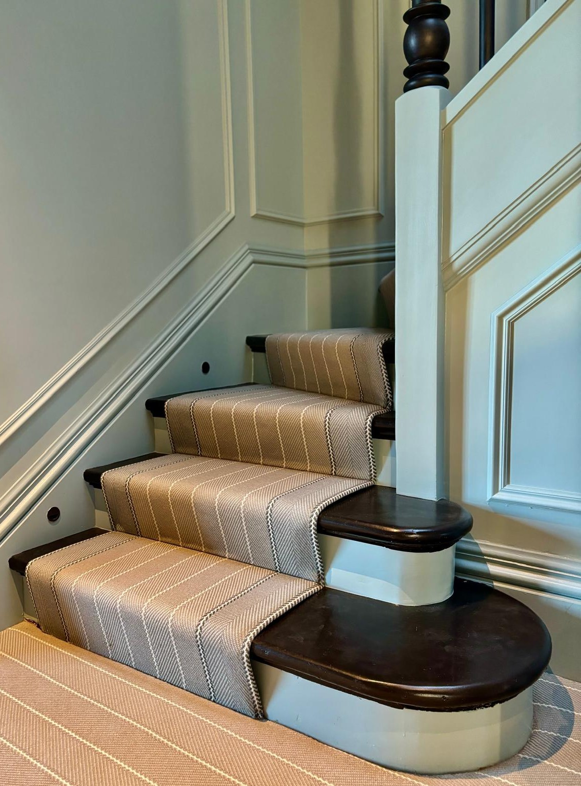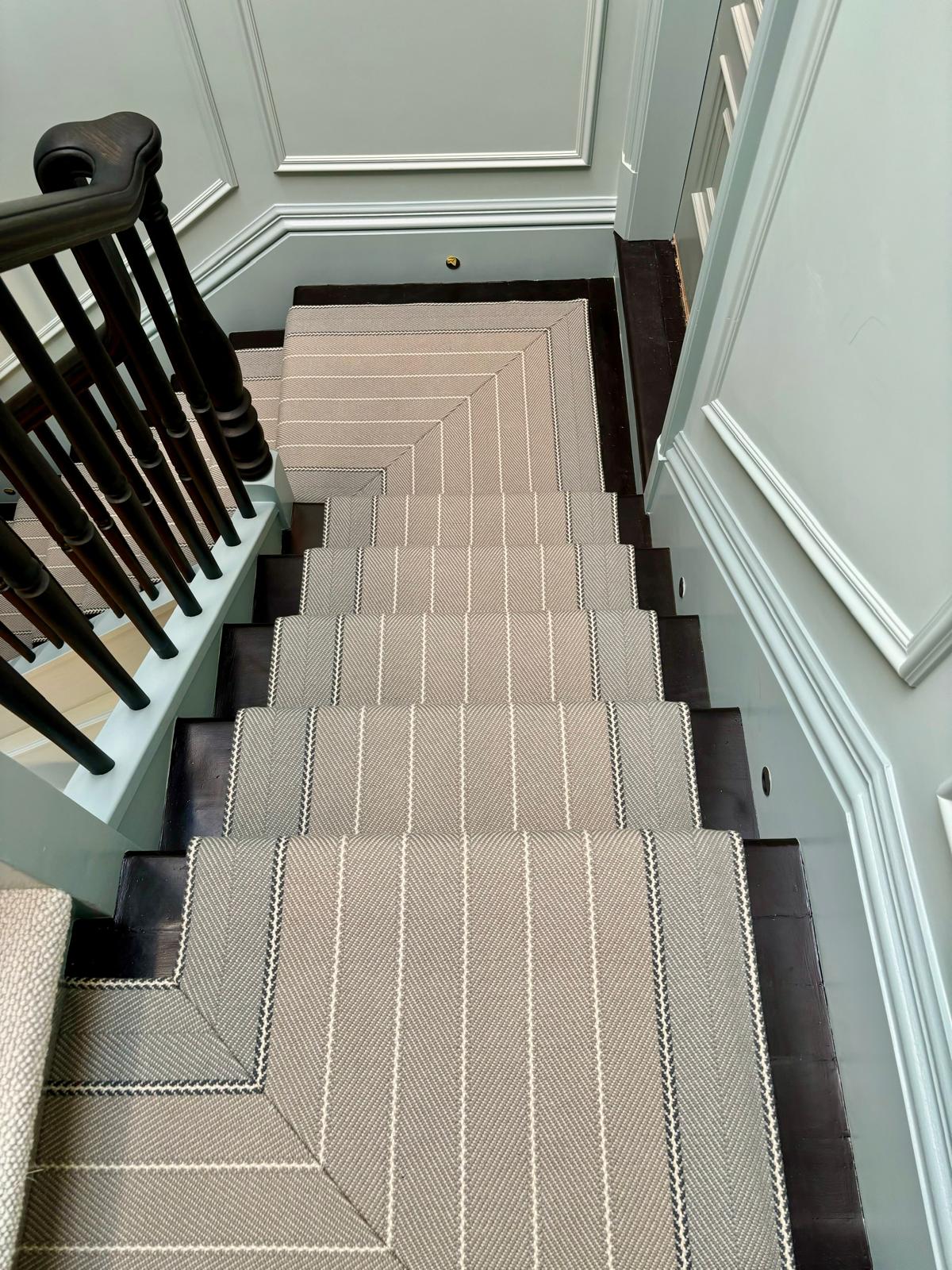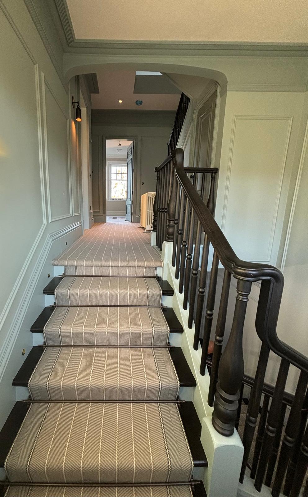 We had the honour of being commissioned to carry out this project by a London-based designer, with whom we have collaborated on numerous occasions. The residence features a particularly grand staircase, for which a bespoke runner was custom made specifically for the space. The installation was undertaken by our highly skilled artisan craftsmen, who completed the work with exceptional care, precision, and dedication, ensuring a flawless finish befitting the elegance of the property.